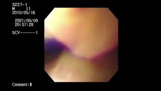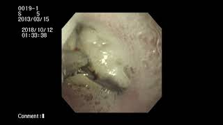 口からスコープを挿入すると、まず食道内に泡沫状の唾液貯留が認められた。