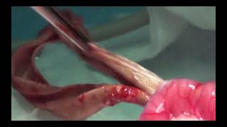 2カ所腸を小切開し、ひも状異物を摘出しました。