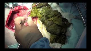 腸切開、異物摘出した後、縫合し、リークチェックを行なっている。