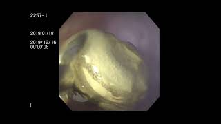 梨をスコープで胃内に押し込んだ後の画像。梨が食道内から消失し、食道全体が胃の入り口まで認められる。